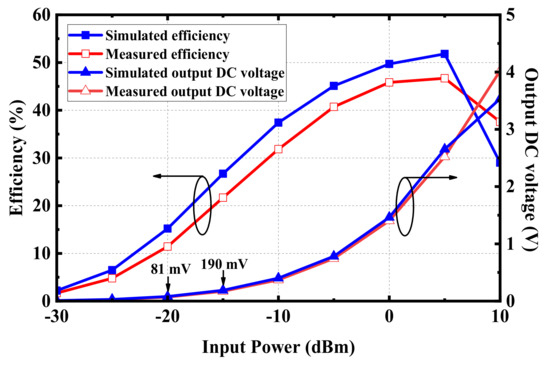 Measured output DC voltage and power transmission efficiency of the proposed rectenna at 915 MHz.