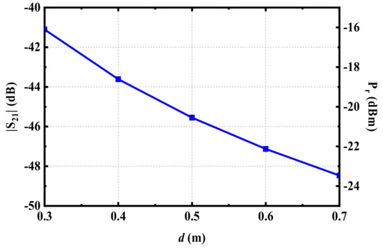 According to the FCC’s relevant regulations on radiating antennas operating in the ISM band, the maximum power input to the transmitting antenna is limited to 30 dBm, and the EIRP cannot exceed 36 dBm. Assuming that the EIRP of Formula (4) reaches the maximum standard and that the transmitting mismatch loss is ignored, it can be stated that the radiation safety of the human body can be guaranteed when the distance x between the transmitting antenna and the receiving antenna is no less than 230 mm.