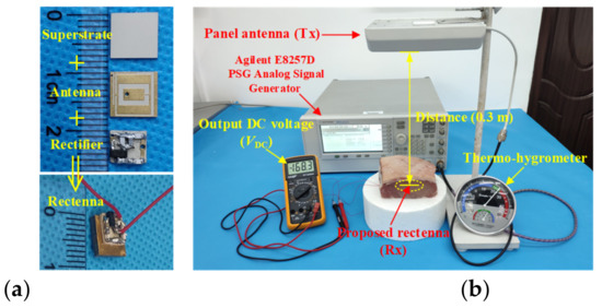 Photograph of measurement setup for wireless power transfer: (a) Fabricated implantable rectenna and (b) measurement setup.