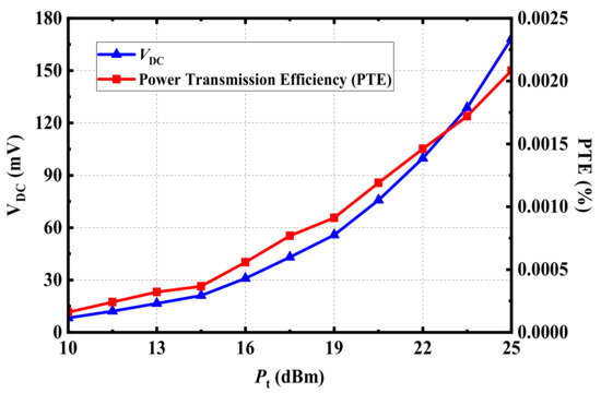 On the premise of meeting the radiation safety requirements discussed above, the performance of the rectenna was tested, as depicted in Figure 18. The selected distance between the transmitting antenna and the receiving antenna was 300 mm. In the RF energy-harvesting experiment, the proposed implantable rectenna was implanted in the muscle layer of fresh pork. The transmitting antenna working as the RF energy source was a panel antenna with a gain of 9 dBi. The transmitting antenna was vertically fixed at a height of 300 mm above the implanted rectenna and was connected to the RF power source by the coaxial cable. The RF power source was an analog signal with a frequency of 915 MHz, and the power was set as 25 dBm, meeting the EIRP standard of less than 36 dBm. At this point, the RF power received by the proposed rectenna could be converted to the DC voltage through its internal rectifier circuit. The output DC voltage measured by the voltage meter was 168.3 mV. In addition, the output DC voltage of the rectenna could be changed by adjusting the input power of the RF power source feeding to the transmitting antenna. Figure 19 shows the power transmission efficiency (PTE) evaluated by the output DC voltage VDC.