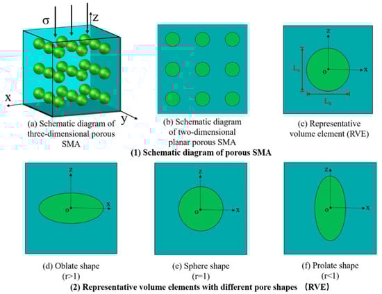 For porous SMA, it is regarded as a uniform porous material with uniform pore shape and uniform orientation, as shown in Figure 1a, where the pores are evenly distributed in space, as shown in Figure 1b. In light of this, when analyzing its mechanical properties, the representative volume unit (RVE), as shown in Figure 1c, can be selected, where the center of the circle is defined as , the horizontal axis is the axis, the vertical direction is the axis, and , represent the diameters of the axis and axis of the ellipse, respectively, then , called the aspect ratio, can be defined to describe the change in pores, from the Figure 1d oblate shape () to the Figure 1e sphere shape () to the Figure 1f prolate shape ().