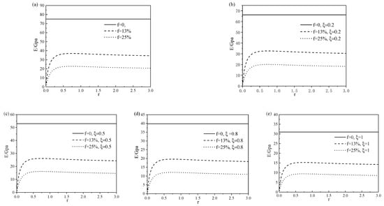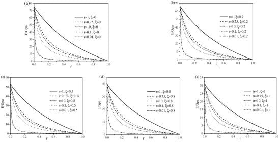 The influence of pore aspect ratio on the Young’s modulus of porous SMA under different porosity is shown in Figure 2. Figure 2a–e show the influence of pore aspect ratio on the Young’s modulus of porous SMA at different phase transformation stages. It can be seen from the figure that when the aspect ratio was between 0 and 0.25, the Young’s modulus changed greatly with the increase in aspect ratio, while when the aspect ratio exceeded 0.25, the aspect ratio had little effect on the Young’s modulus and the modulus was the largest when . For the same aspect ratio, the Young’s modulus decreased with the increase in porosity.