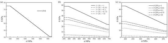 The change in Young’s modulus of porous SMA under different loads is shown in Figure 4. It can be seen from Figure 4 that in the phase transition stage, the Young’s modulus decreased with the increase in load, but remained unchanged in the complete elastic stage. For different pore shapes, the Young’s modulus was the largest when was the largest, followed by , , , and the smallest when .