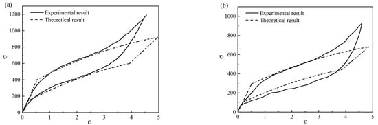 In order to verify the correctness of the theoretical model in this paper, it is necessary to compare the theoretical results with the experimental results. However, it is difficult to prepare porous SMA with different pore shapes, and there have been few experimental reports on the mechanical behavior of porous SMA with different pore shapes. Due to the lack of experimental data, it is difficult to compare the theoretical curve of stress and strain of porous SMA with the different pore shapes in the experimental results. Therefore, in order to verify the correctness of this model, the constitutive model of porous SMA with spherical pores in this paper was compared with the experimental data of porous SMA with spherical pores [17], as shown in Figure 5. The solid line represents the published experimental result, and the dotted line represents the simulation result in this paper. Obviously, the comparison results of the two cases showed a certain degree of consistency between the theory and the experiment, which verifies the correctness of the model in this paper. In contrast, the warping angle at the top of the hysteretic curve depends on the selected theoretical model.