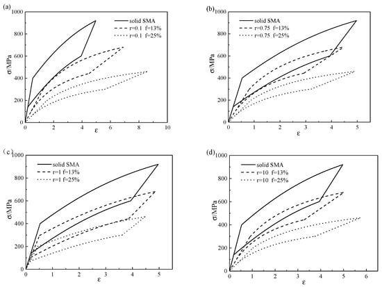When the pore shape is determined, the stress–strain curves of SMA with different porosities are shown in Figure 7. It can be seen from Figure 7 that with the increase in porosity, the phase transformation stresses of the porous SMA gradually decreased, the hysteretic curve gradually moved down and shrank, and the degree of change was the largest when .