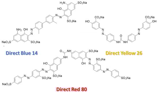 The chemical structure of the direct red 80, direct blue 14, and direct yellow 26, obtained from the ChemDraw database (PerkinElmer, Inc., Waltham, MA, USA).