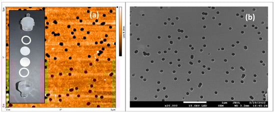 Several substantive anionic direct azo dyes were tested as functionalizing agents for commercially available polycarbonate filters; they were direct red 80 (Alfa Aesar, Ward Hill, MA, USA), direct blue 14 (Tokyo Chemical Industry Co., Ltd, Nihonbashi-honcho, Chuo-ku, Tokyo, Japan), and direct yellow 26 (Tokyo Chemical Industry Co., LTD, Nihonbashi-honcho, Chuo-ku, Tokyo, Japan); their chemical structures are shown in Figure 1. All dyes were used as received from the manufacturers. Sodium nitrate (98+%, Thermo Scientific, Waltham, MA, USA) was used as received from the manufacturer. The 25 µm-thick, 13 mm-diameter, hydrophilic track-etched polycarbonate filters, with 100 nm-diameter pores (Isopore Membrane Filters, MilliporeSigma, St. Louis, MO, USA) were used as received from the manufacturer prior to any functionalization processes. Figure 2 shows (a) an atomic force microscopy image (CoreAFM, Nanosurf, Liestal, Switzerland) and (b) a scanning electron microscopy image (JEOL 7200F-LV Field Emission SEM, Akishima, Tokyo, Japan) of a 5 µm × 5 µm area of an unmodified polycarbonate filter with 100 nm-diameter pores. The inset in Figure 2a shows the disassembled view of the standard polypropylene 13 mm-diameter filter housings and associated components designed to hold the polycarbonate filter.