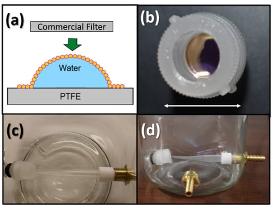(a) The stamping process which transfers the USANP monolayers to the polycarbonate filters; (b) the machined polypropylene filter housings with USANP-functionalized polycarbonate filter installed, where the white arrow below indicates the length scale of 18 mm; (c) the top view looking down inside the custom filtration chamber; (d) the side view of the custom filtration chamber.