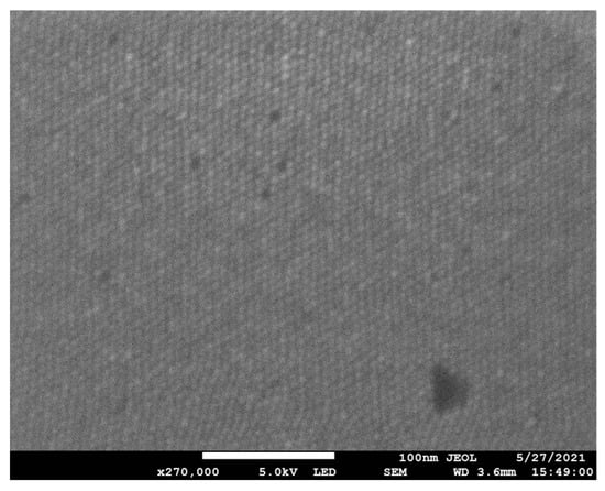 The general inverse micelle synthesis of several-nanometer-diameter gold nanoparticles, which in this work are used to functionalization polycarbonate filters with USANP monolayers, can be found in the literature [80,95,96,97]; however, a brief synopsis specific to this work will be provided for completeness. All glassware and components used in this synthesis were aggressively cleaned with a diluted 1% Alconox–tap water solution (Alconox, Inc., White Plains, NY, USA), rinsed with tap water, then sonicated for 20 min in a diluted 5% elma tec clean A4–tap water solution (Elma Schmidbauer GmbH, Singen, DEU). The glassware was then rinsed with tap water and then rinsed with copious amounts of type 1 water before being placed in an enclosed drying oven (100 L gravity convection oven, Thermo Scientific, Waltham, MA, USA). In a 25 mL standard bulb flask with a magnetic stirrer, a micelle solution was created using 20 mL of fresh sodium distilled toluene (started as ACS grade, Fisher Chemical, Waltham, MA, USA) added to 211.1 mg of didodecyldimethylammonium bromide (DDAB-99%) and this was used to dissolve 72.2 mg of gold chloride (AuCl3-99%) under room temperature sonication for 15 min (Branson 3800, Brookfield, CT, USA). Gold chloride was opened, handled, and resealed in an ultrahigh-purity nitrogen (Airgas, Radnor, PA, USA) environment in a custom in-house built dry box. A 72 µL aliquot, from a freshly made 9.35 M aqueous solution of sodium borohydride (NaBH4, Fisher Chemical, Waltham, MA, USA) that was left to age for 8.5 min, was quickly injected into the DDAB–AuCl3 solution, quickly sealed with a glass stopper, and violently shaken manually by hand. The process was carried out quickly and carefully so the byproduct synthesis gases were quickly released from the bulb flask every 3–5 s to prevent over pressurization of the 25 mL bulb flask, which can violently break apart due to the high reaction pressures. Violent manual shaking was carried out for approximately one minute, releasing the pressure periodically as described, before being placed on a magnetic stir plate (Thermo Scientific Cimarec stirring/hotplate, Waltham, MA, USA) for approximately 1 h and 15 min. Before leaving it to stir, is important that the 25 mL bulb flask not be closed completely. Next, the DDAB–AuCl3–NaBH4 solution was split equally into two 40 mL clean screw-top vials with Teflon septa by pipetting off the supernatant and leaving behind any unreacted solids in the bulb. A measure of 1 mL of dodecanethiol (DDT, 98%) was added to each 10 mL of solution in the 40 mL clean screw top vials and shaken violently by hand for several seconds. The vials were allowed to sit for 5 min before 20 mL of ethanol was added to each vial to precipitate the particles. The collection was aided by centrifugation (Eppendorf, 5804, Hamburg, Germany) at 1500 revolution per min (RPM) for 10 min. The supernatant was discarded, and the remaining particles were vacuum-dried (Buchi, R-100 System, Flawil, Switzerland) for 15 min (water bath at 35 °C and condenser coils at 10 °C, rotation speed 3.5/10) and then resuspended in 10 mL of sodium distilled toluene. With the addition of another 1 mL of DDT to each vial, the solution was heated under reflux at 170 °C for approximately 6 h. The vials were allowed to sit undisturbed after cooling down for one hour before the supernatant was then collected and placed into two separate clean screw top vials with Teflon septa. Unreacted solids were left in the bottom of the screw top vials. To remove synthesis byproducts, the supernatant was precipitated twice in ethanol (Pharmco-Aaper part of Greenfield Global, ACS grade, Toronto, ON, Canada), and centrifugation assisted in this process using 3500 RPM for 20 min for each cycle. After the second wash, the precipitate was dried under vacuum and redispersed in 10 mL of sodium-distilled toluene, which contained a 10−4 volume fraction of DDT. Each vial was then rotated in the water bath of the rotary evaporator at 35 °C for 5 min followed by a brief, several-second sonication to remove any particles from the side walls of the glass vials. Each vial was then centrifuged for 20 min at 3500 RPM and the supernatant was collected and used as the final product for USANP-functionalization. DDAB, AuCl3, and DDT were all from the same company (Acros Organics, Geel, Belgium). All chemicals, except the further sodium distillation of the ACS grade toluene, were used as received from the manufacturer. Sodium metal stored in mineral oil (Sigma Aldrich, St. Louis, MO, USA) was first cleaned by boiling in mineral oil and allowed to cool and solidify with any oxidation layer removed. The sodium was then rinsed excessively with toluene prior to cutting and dispersing in the toluene still (ChemGlass, Vineland, NJ, USA). Figure 5 shows a scanning electron microscope (JEOL 7200F-LV Field Emission SEM, Akishima, Tokyo, Japan) image of a single monolayer of the USANPs on an organic-solvent-cleaned and CO2-snow-jet-cleaned (Applied Surface Technologies, New Providence, NJ, USA) silicon surface (Electron Microscopy Sciences, Hatfield, PA, USA). These are the nanoparticles used in this study for USANP-functionalization of the polycarbonate filters. The particles are separated at a maximum by the 1.77 nm-long interdigitated dodecanethiol ligands bound to the nanoparticle surfaces [98].