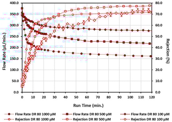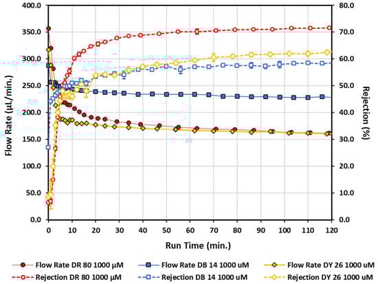 Flow rate and rejection measurements for three different concentrations of direct red 80 as a function of run time. Open data points connected by a dashed line correspond to rejection measurements, while solid data points connected by a solid line corresponds to flow rate measurements. Diamonds—100 µM; squares—500 µM; circles—1000 µM.