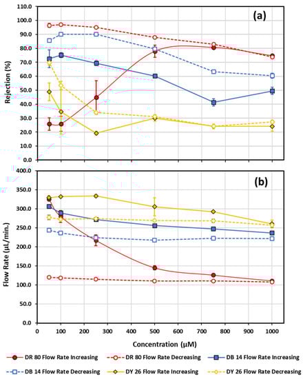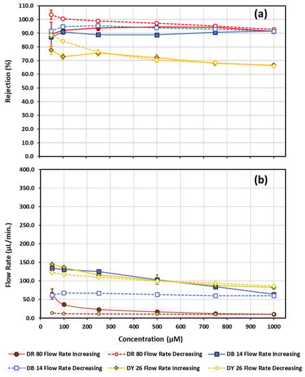 Rejection (a) and flow rate (b) measurements as a function of increasing and decreasing concentration for direct red 80, direct blue 14, and direct yellow 26. Closed data points connected by a solid line correspond to measurements made going from low to higher concentration, while open data points connected by a dashed line correspond to measurements made while going from high to lower concentration. Diamonds—direct yellow 26; squares—direct blue 14; circles—direct red 80.