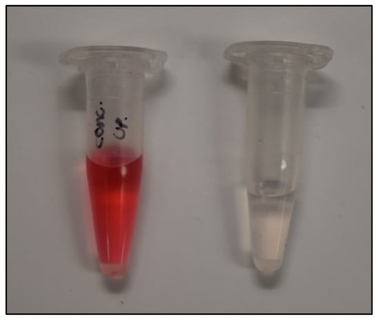 Frequently numbers such as 50 µM and 1000 µM for concentrations of various solutions are found in textbooks, publications, and transparent solutions and sometimes we need a physical reminder of their significance. In the context of textile dyes, 50 µM is highly colored and is at the approximate concentration of textile effluents. The impressive and dramatic near 100% rejection of 50 µM direct red 80 azo molecular dye is shown in Figure 9. The vial on the right contains the permeate of the final decreasing concentration run at 50 µM, shown in Figure 8a, near 100% rejection, and the vial on the left is the 50 µM feed solution fed into the already azo-dye-functionalized filter.