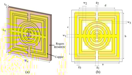 A few factors, such as the size of the substrate, the type of substrate, the number of resonance frequencies, and the properties of the metamaterial structure, are usually taken into account in order to produce a metamaterial structure with good performance. The unit cell and array metamaterial structures were designed and simulated using the frequency domain-based CST Microwave Studio 2018. The CST Microwave Studio software is capable of electromagnetic analysis and design at a broadband frequency. In this study, Rogers RO4003C was chosen as the substrate, and the size was 9 × 9 mm2. The thickness of the Rogers RO4003C substrate was 0.508 mm. The Rogers RO4003C substrate acquired a dielectric constant value of 3.55 and tangent loss (δ) of 0.0027. The metamaterial resonator was designed using copper material and was printed on the Rogers substrate. The thickness of the copper was 0.035 mm, and the electric conductivity (σ) was 5.8 × 10⁷ S/m. The full dimensions of the metamaterial structure are illustrated in Figure 1 and Table 1.