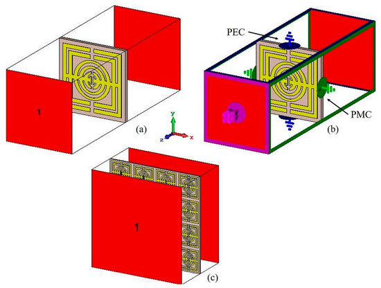 Wave propagation simulation, (a) unit cell metamaterial, (b) boundary conditions, and (c) 4 × 4 arrays metamaterial.