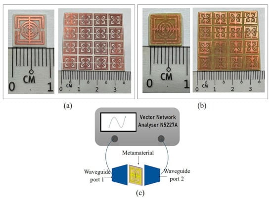 Fabrication was carried out for experimental purposes. The oval-square-shaped split-ring resonator-based metamaterial design for 9 × 9 mm2 unit cell and 4 × 4 arrays was printed on Rogers RO4003C and FR-4 dielectric substrate material. The manufactured unit cell and array metamaterial structure for both substrates are depicted in Figure 3a,b. S-parameters were measured by the Vector Network Analyzer (VNA) N5227A. The fabricated metamaterial structures were placed in between waveguide ports (A-INFOMW WG) and connected to co-axial adapters 137WCAS and 112WCAS for C- and X-band, respectively. The experimental set up for the metamaterial structure is illustrated in Figure 3c.