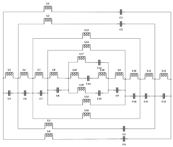 The proposed design structure of the metamaterial was made up of a series of SRR. The metamaterial can be acknowledged from the perspective of a resonant LC circuit with a resonance frequency, , where LT is the total inductance, and CT is the total capacitance of the proposed SRR. A metal strip that represents effective inductance and a gap that represents effective capacitance characterize the SRR. Those elements are passive elements that will receive, store, or dissipate energy in the circuit. ADS Software was utilized to design and validate the equivalent circuit model for the proposed oval-square SRR. Figure 4 shows the circuit model of the proposed metamaterial. The outer square-shaped ring is represented by inductance and capacitance and is marked with L1, C1, L4 and C4, whereas the second square-shaped ring is represented by L2, C2, L3 and C3. Furthermore, the outer oval-shaped ring was symbolized with L13 and L16, the middle oval-shaped ring symbolized with L14 and L15, and finally, the inner oval-shaped ring is shown by L17, L18, C13 and C15. L19, L20 and C14 were assigned to the middle split horizontal strip. The passive components labelled L5 until L12 are the coupling inductors that are connected in series, whereas the components labelled C5 until C12 are the coupling capacitors that are also connected in series.