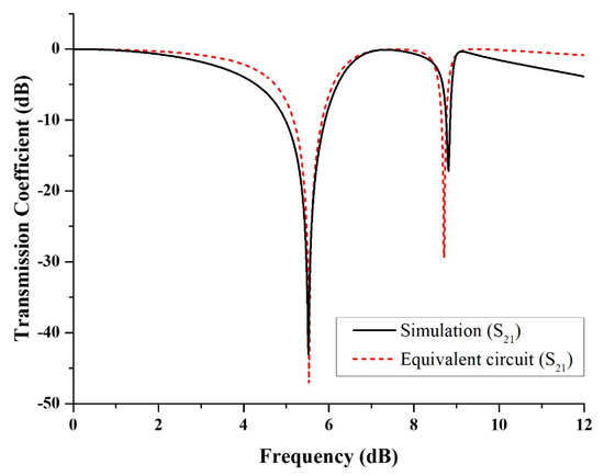 The S21 results from the simulation and the equivalent circuit are compared in Figure 5. The resonance frequencies for the equivalent circuit model are given at 5.53 GHz and 8.70 GHz with magnitudes of −47.08 dB and −29.40 dB, respectively. Meanwhile, the resonance frequencies of S21 for the simulation results are 5.52 GHz and 8.81 GHz with magnitudes of −43.03 dB and −17.19 dB, respectively. Because the equivalent circuit is made up of a series of passive elements, the energy dissipation is customized by the inductance and capacitance, the magnitude of S21 tends to be smaller. Despite having a difference in the magnitude of the S21, the resonance frequencies of the simulation and equivalent circuit results are almost the same.