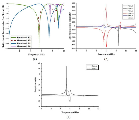 (a) Transmission (S21) and reflection coefficient (S11) of simulation and measured result, (b) simulation result for permittivity, permeability, and refractive index, and (c) impedance.