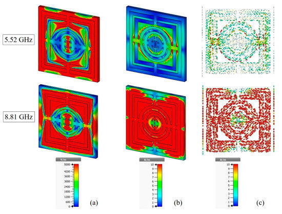 The structure of artificial materials can be modified to obtain appropriate values of permittivity and permeability for applications. Figure 7 shows the electromagnetic properties of the artificial material. Electromagnetic waves are associated with a frequency and a wavelength, and they travel at the speed of light, c. The relationship between the wave characteristics can be explained by the equation c = fλ. The higher the frequency, the shorter the wavelength. As a result, a higher frequency carries more energy. That being the case, electromagnetic waves with a frequency of 8.81 GHz interact more strongly than electromagnetic waves at the frequency of 5.52 GHz. The red zone at the metamaterial structure of both resonance frequencies in Figure 7a indicates that there was a strong electric field reaction at the gap of the square shaped SRR and at the gap of the center of the oval-shaped metal. It means that the capacitor stores and releases charge across the SRR gaps. Meanwhile, the magnetic field result shown in Figure 7b indicated that the metal strip acted as an inductor, storing electrical energy in the form of magnetic energy. Because the magnetic field was created by an electric current, looking at Figure 7b,c, it it clear that the magnetic field was dependent on the current density. Because there was low current flow at a resonance frequency of 5.52 GHz, the magnetic field at the metal gap was minimal. Due to the larger current density, a strong magnetic field was sensed at the metal strip that joined the square and oval shapes. Furthermore, the current density was lower at the metal gap and the center of the oval-shaped SRR at the resonance frequency of 8.81 GHz, affecting the weaker magnetic field interaction. Due to the high concentration of current density, the magnetic field was stronger at the metal strip of the square and outer oval shapes of the SRR. Figure 7c demonstrates the proposed SRR’s current distribution. As can be observed, the current was concentrated throughout the oval-square shape SRR. At the resonance frequency of 8.81 GHz, large amounts of current were concentrated practically all across the oval-square-shaped SRR, as opposed to the resonance frequency of 5.52 GHz, where the current was primarily concentrated at the connection metal between the oval- and square-shaped SRRs. A certain part of the metal cannot be coupled with the incident waves because the electric field polarization direction of the incident wave was in the y-axis direction; meanwhile, the magnetic field polarization direction was in the x-axis direction. Furthermore, the oval-square-shaped SRR’s symmetrical design allows the current to flow in the opposite direction.