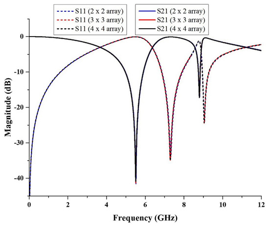 The comparison of the S-parameter results for 2 × 2, 3 × 3 and 4 × 4 arrays.