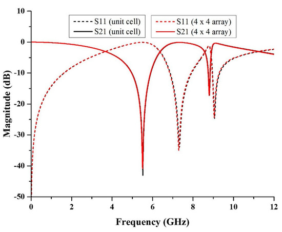 Comparison of the S-parameters for the unit cell metamaterial structure and 4 × 4 array structure.