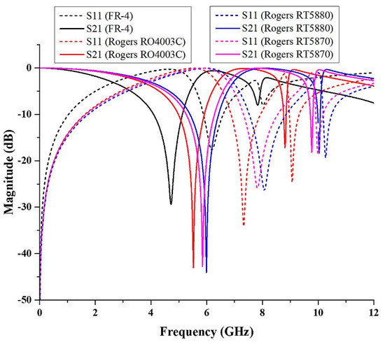 Comparison of the S-parameters result for metamaterial structure using different substrates.