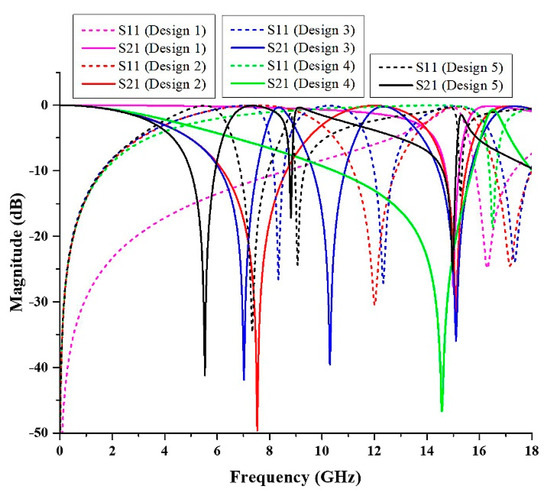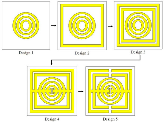 The metamaterial structure was altered until the desired simulated results were achieved. In this study, the metamaterial structure was designed for C- and X-band applications. Thus, the design was tweaked in a series of steps, as shown in Figure 11. Firstly, the structure just included three rings of oval-shaped SRR. The simulated result, on the other hand, revealed that the metamaterial structure obtained a resonance frequency of 13.34 GHz (Ku-band). Then, a square-shaped resonator was added. The transmission coefficient result improved to dual resonance frequencies of 7.52 GHz (C-band) and 15.08 GHz (Ku-band). Since this study was focused on the C- and X-bands, the design 3 structure was created by adding another square-shaped split ring resonator. The resonance frequency was gained at 7.02 GHz (C-band), 10.30 GHz (X-band), and 15.10 GHz (Ku-band). The metamaterial structure must have a compact size; therefore, a lower resonance frequency needs to be achieved by the design. Having said that, another metamaterial structure was designed by connecting each of the rings with a split horizontal bar. However, the resonance frequency manifested by design 3 shifted to only a single frequency at 14.56 GHz (Ku-band). Finally, the metamaterial structure was designed with a gap between the oval and square-shaped rings to split the ring. The resonance frequency was improved to 5.52 GHz (C-band) and 8.81 GHz (X-band). The result of the for the performance of the steps taken was assembled in Figure 12.
