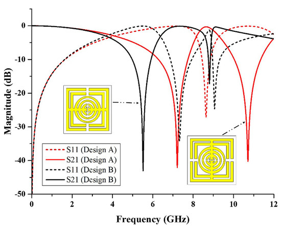 From the simulated result, it can be identified that the design of the metamaterial structure affected the resonance frequency. In further observations, the oval-square-shaped SRR was rotated 90° to the right, as shown in Figure 13. It can be seen that, from the figure, the S-parameter result of design A was different from that of design B. Based on the simulated result, design A exhibited dual band resonance frequencies at 7.21 GHz (C-band) and 10.72 GHz (X-band) with magnitudes of −42.05 and −40.24 dB, respectively. Meanwhile, design B also manifested dual bands at the resonance frequency of 5.52 GHz (C-band) with a magnitude of −43.03 dB, and 8.81 GHz (X-band) with a magnitude of −17.19 dB. Based on the result, although the design is identical, by changing the position of the metal gap, it will affect the resonance frequency. The difference in the resonance frequencies happened due to the electric and magnetic field polarization directions. Hence, when designing the metamaterial structure, researchers can consider rotating the position of the metal to identify the best structure for the desired properties for the applications.