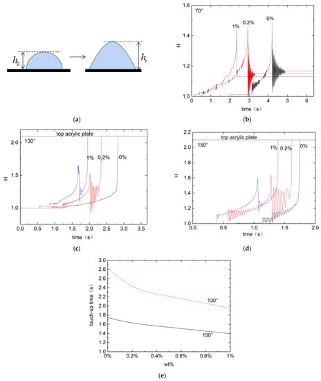 Figure 2a shows droplet shapes on the ITO glass substrate before and after applying the electrical field in the pin-plate electrode system. The initial droplet shape, shown on the left, varies depending on the wettability of the substrate. For a droplet of volume 5 μL, the initial height is measured as = 1.3 mm, 1.8 mm, 2.08 mm and 2.12 mm, respectively, for contact angles , , and . After applying the voltage (11 kV), the droplet starts to deform soon after a time lag for the polarization of the top acrylic plate. For all three scenarios shown in Figure 2, evolutions to an equilibrium, to a bridge, and to a take-off are not monotonic, but with transient oscillations due to competing effects of gravitational, capillary, and electrostatic forces. Additional effects of viscoelasticity seem to amplify (for bridge and take-off) or weaken (for equilibrium) these oscillations depending on the scenario, but always shorten the evolution time. On hydrophilic substates droplets have relatively bigger footprints with lower height, and equilibration occurs after the oscillatory transiency with the balance of forces involved. On hydrophobic substrates droplets can touch the top acrylic plate, eliminating the possibility of equilibration. It is observed that regardless of the wettability of the substrate the time lag is longer for Newtonian droplets than those with nonzero PEO concentrations. The droplet deformation is accompanied by the change in its height from the initial value to with time. Figure 2b–d show the change in the droplet height against time in measures of its initial value: