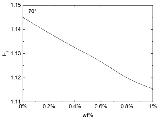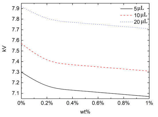 The critical voltage for the take-off phenomenon of the droplet on the superhydrophobic (contact angle ) substrate is further investigated, as show in Figure 9. Three different droplet volumes of , , and are chose to analyze the effect of droplet size along with PEO concentrations ranging from 0 to 1%. The take-off voltage required for water droplet (0%) is significantly higher than that of PEO aqueous solution, and the take-off voltage required by PEO aqueous solution has a smooth linear decay with the increase in concentration. As the concentration of PEO aqueous solution increases, the dielectric constant decreases gradually, and so the required voltage also decreases gradually. The critical take-off voltage increases with the droplet volume, regardless of the PEO concentration. Previous studies reveal that the practical contact area between a hydrophobic surface and water governs the net charge amount of the droplet on the surface [44,45]. A larger droplet thus increases the Coulomb force because it increases the electric charge on the droplet. A larger droplet size also increases the moving resistance because of the increase in the three-phase (solid–liquid–air) contact lines that are known to govern the movement of water droplets on solid surfaces [46]. Droplet size has more of an effect on Coulomb force than on the moving resistance, as the former depends on the contact area while the latter depends on the contact line. Therefore, the electric field required for droplet movement decreases with the increase in droplet size. Under a vertical electric field, Coulomb force on the droplet should overcome the sum of the adhesion force and gravity. Both adhesion force and gravity increase as the droplet size increases. The adhesion force is originally the same as the moving resistance mentioned above, and depends on the three-phase contact lines. However, gravity to a water droplet depends on the droplet mass, namely the droplet volume. The droplet size has more of an effect on gravity than on Coulomb force because the former depends on the droplet volume while the latter depends on the contact area, which relates to the square of the droplet radius [47]. The electric field required for droplet launching thus increases as the droplet size increases.