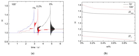 Figure 4 shows droplet evolution on a hydrophobic substrate with a contact angle of , which is not high enough to exhibit the bridge with the top acrylic plate or the take off. As with the hydrophilic substrate, for the high enough voltage (11 kV) applied the droplet goes through severe transient oscillations before reaching the final equilibrium state. Both the maximum transient peak for the droplet height and the final equilibrium height are seen to decrease with the PEO concentration. The contact angle observed is insensitive to the PEO concentration tested in this study. The initial droplet height thus is independent of the PEO concentration. Regardless of PEO concentration droplets on a hydrophobic substrate would stand higher than those on a hydrophilic substrate. Figure 4b shows the transient maximum and final equilibrium droplet height with respect to the PEO concentration. Decrease in these heights with the PEO concentration is obvious, as seen also on a hydrophilic substrate. While the transient maximum is consistently higher on the hydrophobic surface, however, the equilibrium height observed is higher on the hydrophilic substrate. This reverse in the height is caused by the electrowetting present only with the dielectric PDMS substrate used for the contact angle [43].