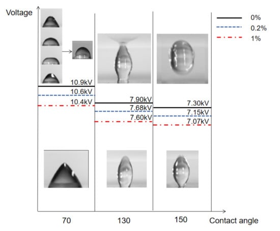 The phenomena shown above, including the severe transient oscillations before equilibration, bridging with top acrylic plate, and the take-off from the substrate, require high enough electric field to be applied. It is thus of great importance to identify the critical voltage for each phenomenon, which should vary with the wettability and the elasticity of the droplet. In Figure 5, the critical voltage is shown for three different contact angles and PEO concentrations for a droplet volume of on the ITO glass. The severe transiency with final equilibrium shown on a hydrophilic substrate (contact angle ) is to be observed for voltages exceeding 10.9 kV, 10.6 kV, and 10.4 kV, respectively, for PEO concentration of 0%, 0.2%, and 1%. The critical voltage is seen to be maximum for the Newtonian droplet, and to decrease with the increase in the elasticity. Below these critical voltages, droplets evolve monotonically to an equilibrium without complicated transiency. The bridging phenomenon of droplet reaching the top acrylic plate is observed for voltages higher than 7.9 kV, 7.68 kV, and 7.6 kV, respectively, for PEO concentration of 0%, 0.2%, and 1%. Again, more elastic droplets require lower voltage for the bridging. Below the critical voltage, droplets saturate to an equilibrium, as shown in Figure 5. The critical voltage for droplets to take off from the superhydrophobic substrate also decreases with the PEO concentration, as shown for the case of contact angle. For all cases shown, droplets reach an equilibrium shape for a low applied voltage. The critical voltage to escape this monotonic equilibrium decreases with the contact angle and the PEO concentration.