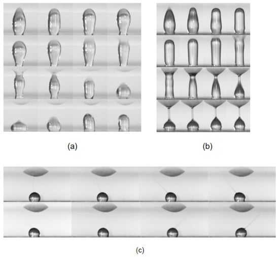 The liquid bridge phenomenon at a contact angle of . (a) After the water contacts the top acrylic plate, a liquid bridge is formed for a short time, and then disappears; (b) PEO aqueous solution produced obvious liquid filaments after contacting the top acrylic plate; and (c) a phenomenon similar to electrospinning appears after the liquid filaments becomes thinner.
