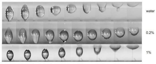 In the take-off phenomenon of droplets detaching from the superhydrophobic substrate, water and PEO aqueous solution also produced different behaviors. As shown in Figure 7, after the electric field (11 kV) is applied, the water droplet is stretched for a whole, and then the bottom is detached from the substrate, forming an oblate sphere, flying towards the top acrylic plate. The PEO aqueous solution takes a long time in the stretching process, and flies to the top acrylic plate in a spherical shape when separated from the wall, with a liquid filament appearing at the bottom during the flight. During the take-off process of the high-concentration PEO aqueous solution, the top is slightly stretched into a cone, and there is no obvious deformation in the process of flying to the top acrylic plate, but with a very thin liquid filament formed at the bottom.
