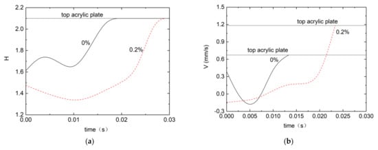 For the process of droplet takeoff in Figure 8, comparisons are made for Newtonian and 0.2% PEO droplets. We compared the changes of position and velocity during the take-off of the droplet, respectively, using the previous time interval in which the severe deformation occurred as a reference target. We determined the position of the droplet by observing the value of of the droplet, we found that the value of the droplet before the violent deformation (initial position) was larger than that of the PEO droplet, and the bottom of the droplet collided with the top because the bottom of the droplet was detached from the bottom plate, this results in a faster drop rate for water droplets and a slower, more gradual drop for PEO droplets. In terms of speed, the water droplets fly much faster than PEO droplets, and touch the top acrylic plate in a shorter time. Negative velocities for a time interval are generated as the droplets collide and fuse in the air. Here, the recorded time interval is 33 ms.