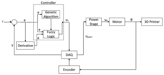 The controller block comprises a hybrid technique between fuzzy logic and genetic algorithms. The DAQ is in charge of converting the signals to adequate values so that the computer can understand the measurements. The power stage raises the voltage and current levels delivered by the DAQ, and thus makes the system capable of moving the selected motor. This motor, in turn, is the actuator that modifies the position of the base in the printer. Table A1 shows the variables used in Figure 1. Figure A1 shows how the mentioned variables interact with each other, as well as the workflow of the methodology.