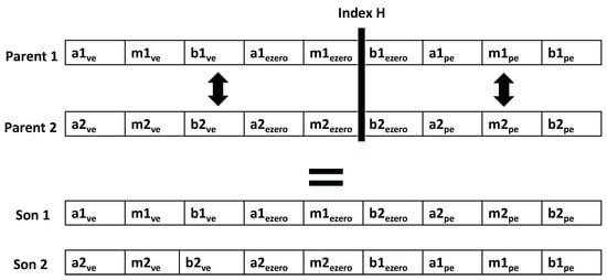 In reproduction, the algorithm seeks to follow the example of nature, where genetic diversity is present through sexual reproduction. In GA, a pair of individuals cross their genes and generate two children that combine the characteristics of both parents. Crossing, or reproduction, is synonymous with mating between two individuals of a different sex [42].