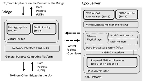 The bridges in the LAN can operate in a general-purpose computing platform. It contains a virtual switch supporting link aggregation and traffic shaping based on the commands from QoS server by the Openflow protocol. In addition, each bridge supports the delivery of data packets to/from the other bridges in the LAN by user datagram protocol (UDP). In Figure 1, the components developed by this study are highlighted. We have also marked the corresponding sections for the highlighted components.
