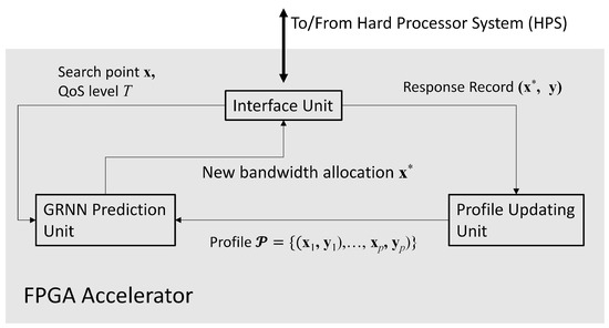 We can see from Figure 1 that dedicated FPGA circuits are implemented as accelerators for the VNFs in the SoC for QoS management. In this way, the latency for QoS management can be effectively reduced. The FPGA-assisted SoC can be separated into two portions: hard processor system (HPS) and FPGA accelerator. The HPS contains a hard core processor, a main memory, and an Ethernet physical layer. The HPS is responsible for delivering control packets between the QoS server and a bridge. The delivery of control packets is based on the Openflow protocol. The HPS operates with the FPGA accelerator through HPS-FPGA interface. The FPGA accelerator carries out the GRNN-based quality prediction and the proposed profile updating algorithms in the SoC.