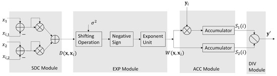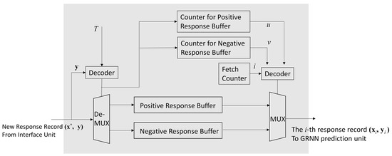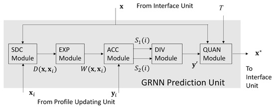 As shown in Figure 2, the proposed FPGA accelerator contains three parts: the GRNN prediction unit, the profile updating unit, and the interface unit. The interface unit is designed for the interaction with the processor of the SoC. The interface unit has simple architecture mainly containing buffers. The processor of the SoC is able to access the buffers in the interface unit for providing source data and collecting computation results from the accelerator. The goal of the GRNN unit is carry out the computation of (13) by FPGA. The profile updating unit is responsible for performing the record replacement operations in Algorithm 2. In the following subsections, we focus on the discussions of GRNN prediction unit and the profile updating unit.
