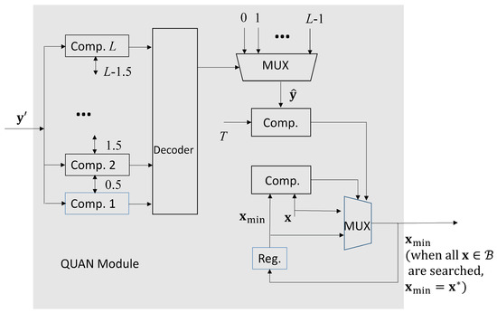 There is only a single FP divider for the computation of in (8) in the DIV module. From Figure 5, we see that the is further processed by QUAN module. It then produces the final result in (11). As shown in Figure 5, we let be the current . When , and , then is updated as . When all the in is searched, the final is the final bandwidth allocation result .