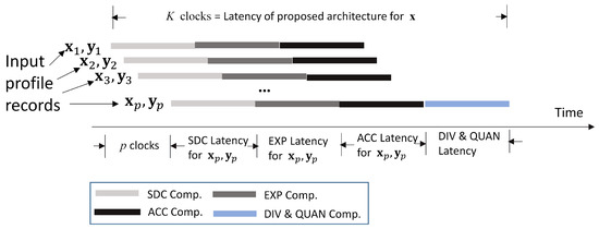 The ACC module is responsible for the computations of both and . Note that the EXP module only provides for , sequentially. As a result, the ACC module offers the accumulation of the partial sums and , defined as