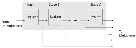 Given a candidate , the goal of SDC module and EXP module are to compute in (10) and in (9), respectively. Specifically, the computations of in (10) are carried out in the SDC module. In this study, the core network contains only 2 links (i.e., ). Therefore, we need only two Floating Point (FP) multipliers and three FP adders in the SDC module. In the FP arithmetic operators, all the numbers are in IEEE 754 single precision format [23]. In the EXP module shown in Figure 4, there is only a single FP exponent computation unit for the computation of . The in (9) is chosen as a power of 2 so that the division operation for is equivalent to simple shifting operations.