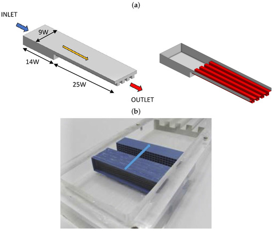 (a) Sketch of the domains dimensions and detail of the heated (red color) fin walls. (b) View of the experimental prototype (lid was retired for the picture), of dimension W = 10 mm, used to validate the numerical model.