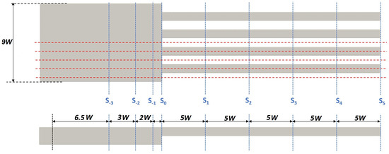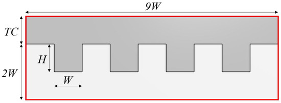 The problem analyzes the confined flow of liquid water at low to moderate Reynolds number inside different multi-channel devices, as shown in Figure 1. The device is formed by four heated rectangular channels (or fins), of fixed width W, downstream connected to a chamber. The device has a tip clearance (), measured between the top part of the fins and the lid of the device (see Figure 2), aimed to significantly diminish the pressure drop in the heat sink. The connection between the chamber and the channels is made by a forward step-like structure of height equal to . Thus, the dimensions of the device inlet section, outlined in red in Figure 2, is . The flow cross-section in the channels region, shaded in gray color in Figure 2, is , where H is the channels height. Four different tip clearances ratios,