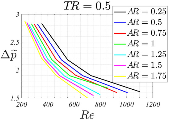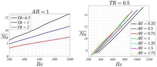 A limiting case that could be considered for comparison purposes is the one corresponding to = 0 (H = 0). This case involves a rectangular section channel with no fins present. Thereby, since it addresses the simplest channel geometry, it could be used to quantify the practical effect of actually implementing fins on the most basic geometry. When assuming laminar flow, the Nusselt number in a rectangular channel can be obtained by analytical means, see for example [29]. In practice, the ensuing Nusselt numbers (that do not depend on the Reynolds number in the laminar regime) are tabulated as a function of the rectangular channel aspect ratio. In this limiting case, in the problem under consideration, channel height and width are and respectively (see Figure 2). Then, the channel aspect ratio is . For some representative values of considered in this study (0.5, 1 and 2) the associated Nusselt numbers are: 7.5, 5.6 and 4.4, respectively. As it could be observed in the right plot of Figure 4, Nusselt numbers associated to the finned geometry are higher than those values for Reynolds numbers larger than about 300.