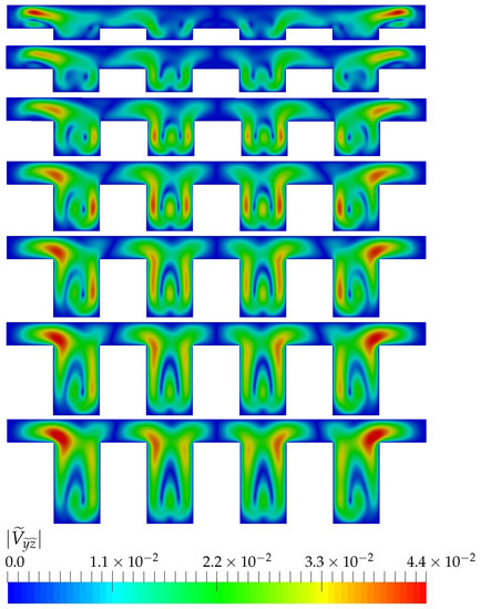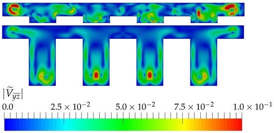 Local topology of the flow for is visualized in Figure 6, plotting the absolute value of the (transverse) velocities components in the directions ( and ) at the transverse plane of the device (see plane location in Figure 3):