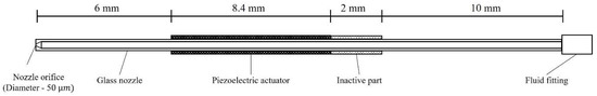Experiments were conducted using a single nozzle inkjet head MJ-AT-01 with a nozzle diameter of 50 μm, manufactured by MicroFab Technologies (Plano, TX, USA). Figure 1 shows the configuration and dimension of the head. Conical nozzles in clear glass allow easy visual access to show the meniscus movement inside the nozzle. The inkjet head is operated by a squeeze-type piezo-actuator that expands and contracts in the radial direction, depending on the polarity of the supply voltage. The exterior of the nozzle is hydrophobic coated with diamond-like-carbon (DLC) treatment to prevent the surface from wetting at the nozzle tip. The amplitude of the waveform was varied (26−46) V at intervals of 2 V. An operating frequency of 1 kHz was applied to ensure sufficient time to capture the entire meniscus motion and ensure stable jetting.