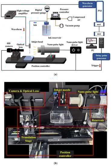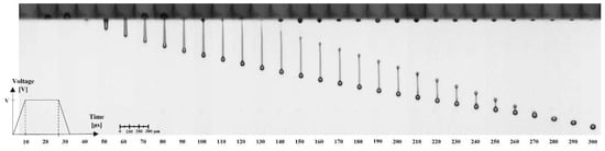 - Kwon, K.-S. Experimental analysis of waveform effects on satellite and ligament behavior via in situ measurement of the drop-on-demand drop formation curve and the instantaneous jetting speed curve. J. Micromech. Microeng. 2010, 20, 115005. [Google Scholar] [CrossRef] [Green Version]