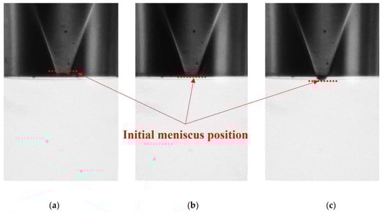 Initial meniscus position by control of the supply pressure: (a) −3 kPa, (b) 0 kPa, and (c) +3 kPa.